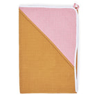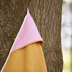 Kapuzenhandtuch weiße Punkte auf Koralrosa Waffel Piqué mustard